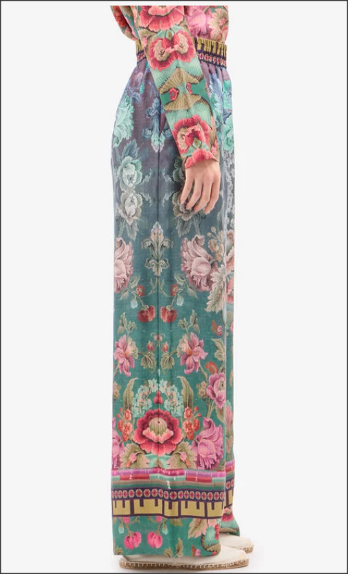 Exquisitos pantalones de seda de pierna ancha que muestran un tapiz hipnotizante de motivos florales en azul verdoso intenso y fucsia vibrante.